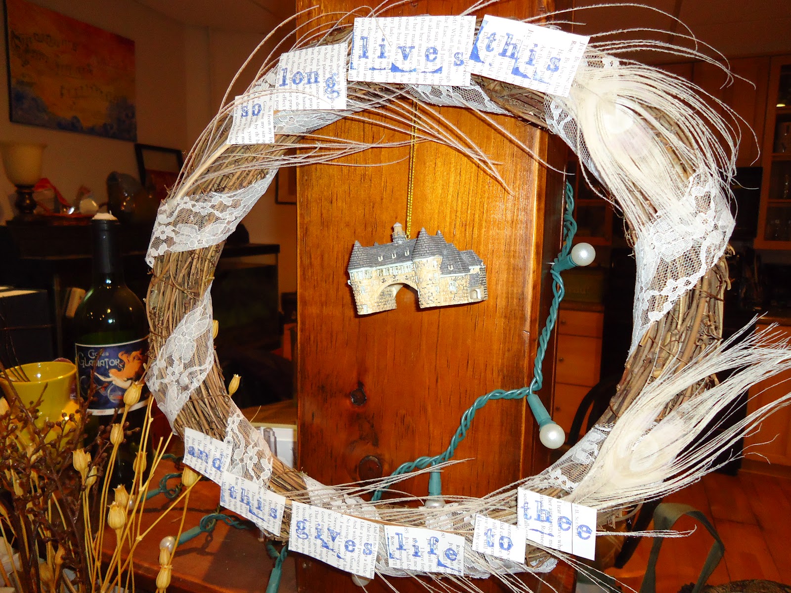 I thought I was done, but there was something still missing. I remembered I had three white peacock feathers left from when I made my hair flower, and used them as extra flourishes on the wreath. Here's how it turned out!